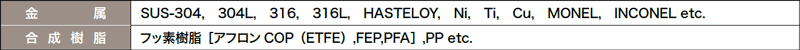 適用材質は各種金属、合成樹脂(フッ素樹脂やプラスチック製繊維)の細線として供給される材質はほとんど製作可能となりますので、耐熱性、耐食性、耐薬品性等使用条件に合わせて幅広く選択できます。